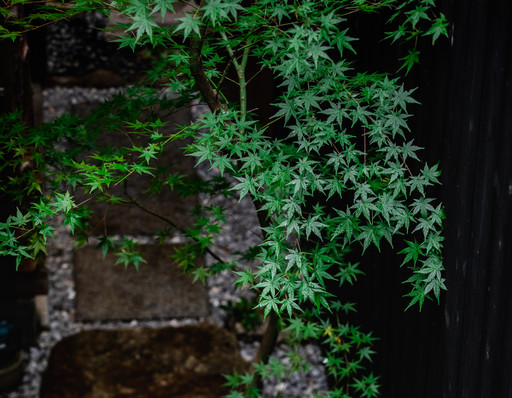焼杉のキャンバスに紅葉のアウトラインが映える坪庭。